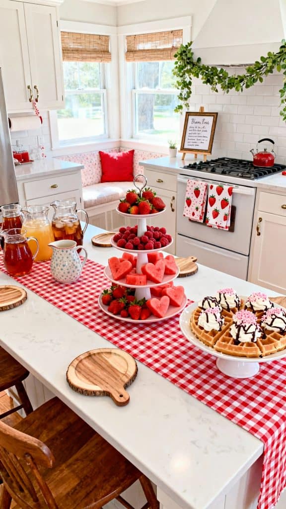 Turn your kitchen and breakfast nook into a bright, berry-scented brunch spot. It’s casual, cheery, and ridiculously easy to pull off with seasonal fruit and gingham accents. Guests hang around the island and never want to leave.