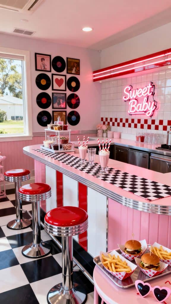 Go playful with a 1950s soda fountain vibe, but make it Valentine’s. Pink neon, glossy surfaces, and treats-on-treats. It’s nostalgic, upbeat, and super guest-friendly.
