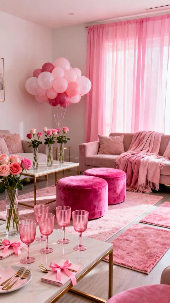 - Floor-to-ceiling pink drape panels or temporary fabric backdrops