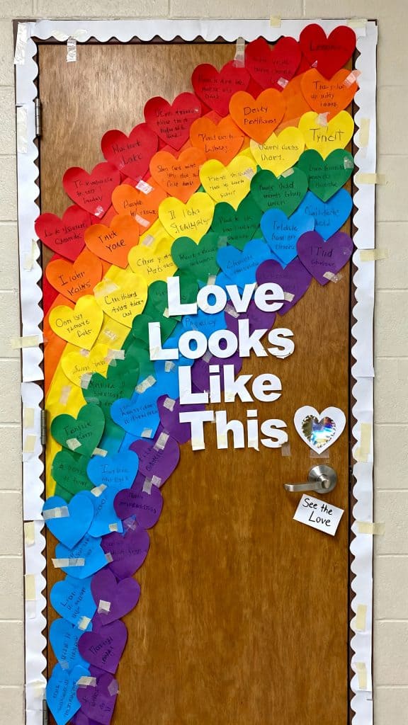 End on a feel-good, inclusive statement piece. Create a full rainbow cascading diagonally across the door using layered heart cutouts in red, orange, yellow, green, blue, and purple.