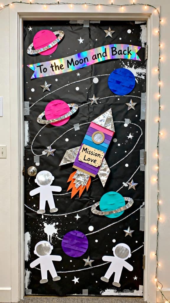Take it to space with a cosmic door that absolutely glows. Cover the door in matte black paper, then splatter with white paint for stars. Add planets in candy colors and a rocket labeled Mission: Love.