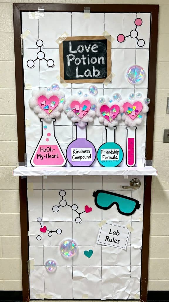 Think candy-colored science lab meets Valentine sparkle. Use white paper as a tile “backdrop” and line a shelf across the door with cutout beakers and flasks bubbling over with heart-shaped foam.