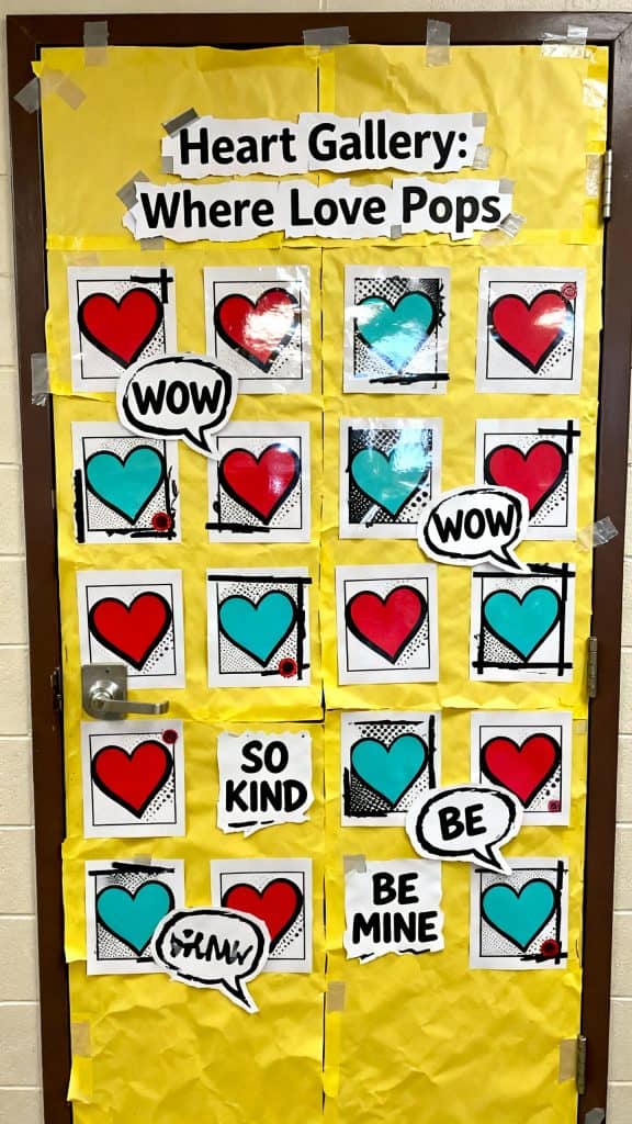 Channel bold, graphic energy with a pop art gallery. Cover the door in bright yellow, then arrange square “canvases” featuring comic-style hearts with halftone dots and black outlines.
