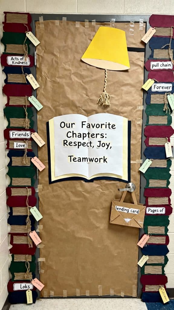 Create a faux reading lamp from cardstock with a dangling “pull chain.” In the center, a large open book displays a message: Our Favorite Chapters: Respect, Joy, Teamwork. Tuck in paper bookmarks labeled with student names.
