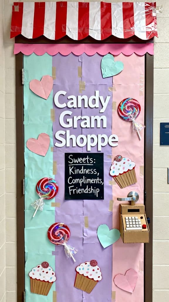 Cover the door in pastel paper and “stock the shelves” with oversized candy cutouts: conversation hearts, lollipops with cellophane wrappers, and glitter-sprinkled cupcakes. Add a big sign that reads Candy Gram Shoppe with a chalkboard-style menu listing “Sweets: Kindness, Compliments, Friendship.”