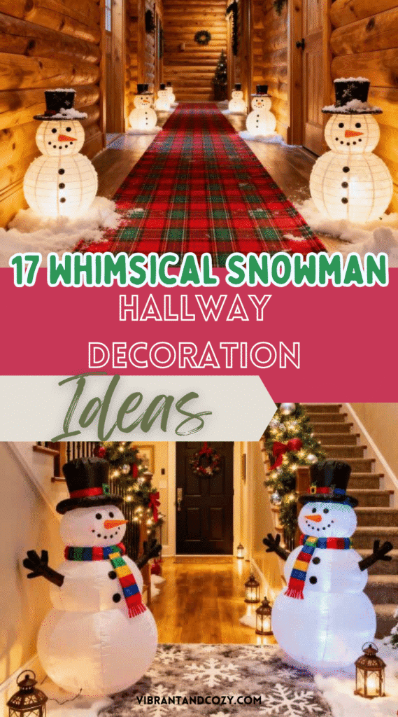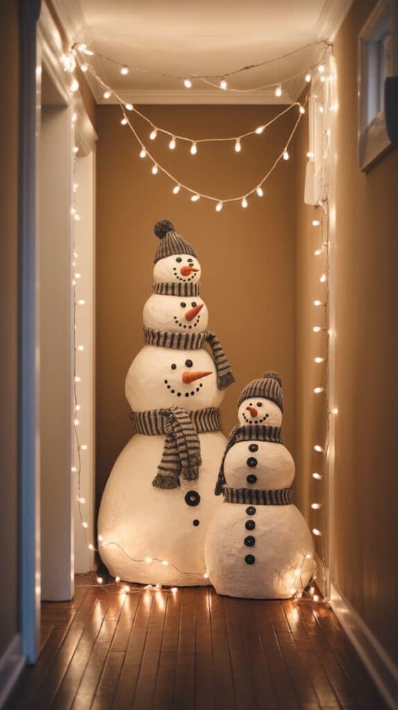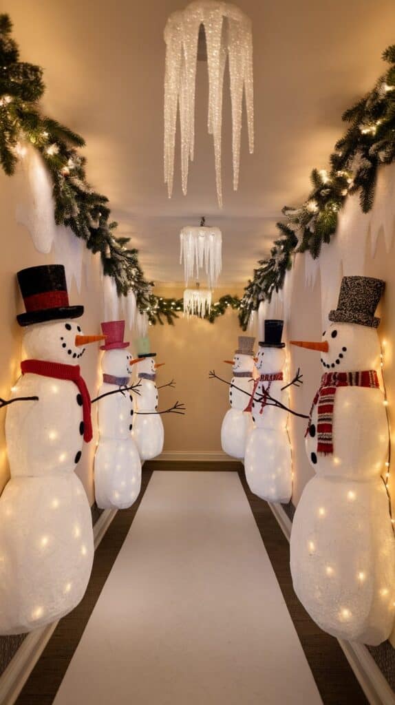 Next, place some snowman lanterns along the hallway. They give off a soft glow and make the space feel friendly.