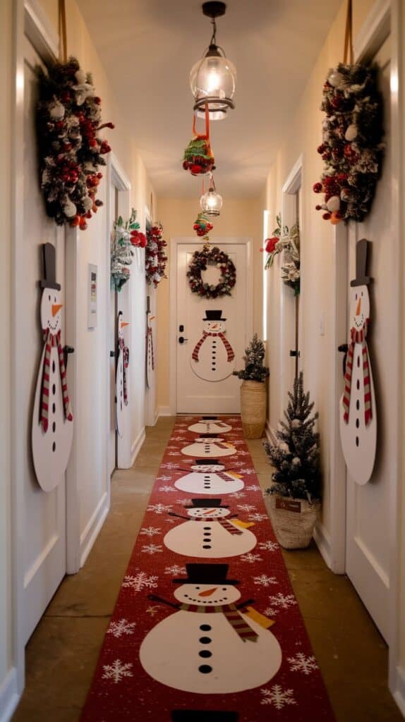 If you want to make your hallway feel festive, try using snowman decorations. Start by laying down snowman-themed runners on the floor. They add a fun touch and guide your guests through the space.