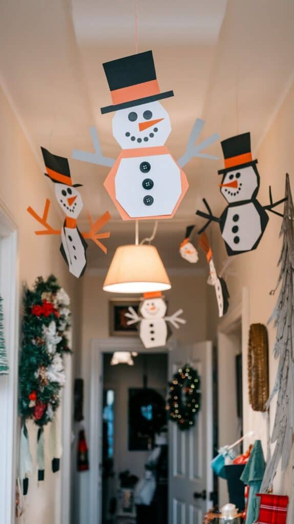 If you want to add some fun to your hallway, try hanging paper snowman crafts from the ceiling.