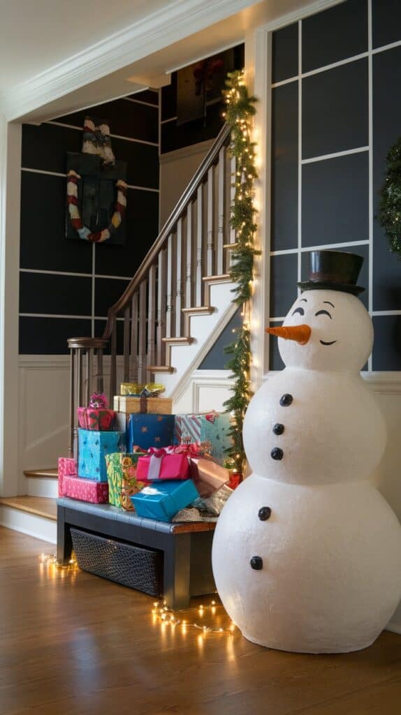 Next to the snowman, there’s a bench filled with colorful gifts. This makes the hallway feel warm and inviting.