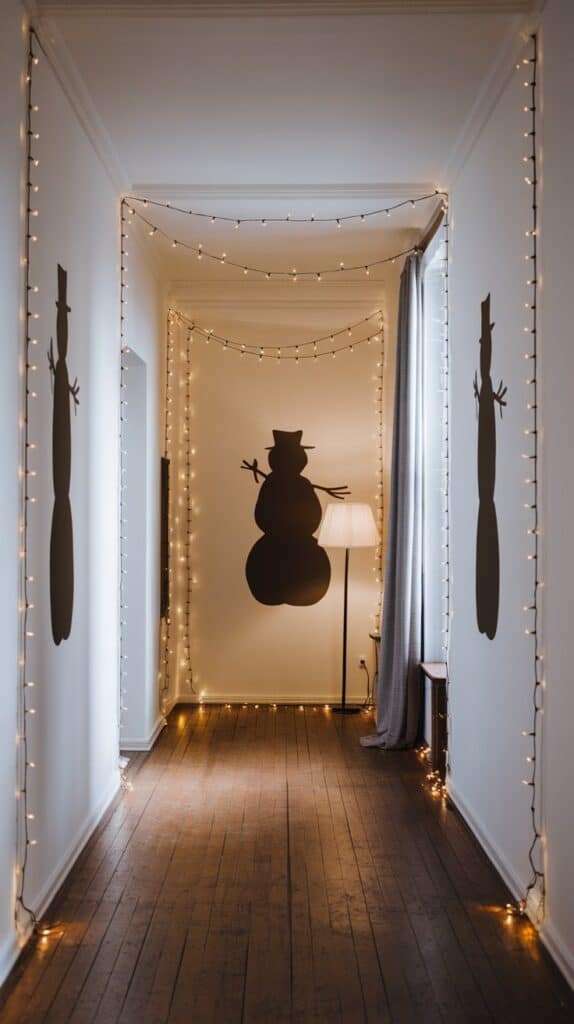 Minimalist Hall With White Walls, Snowman Silhouettes, And Subtle String Lights