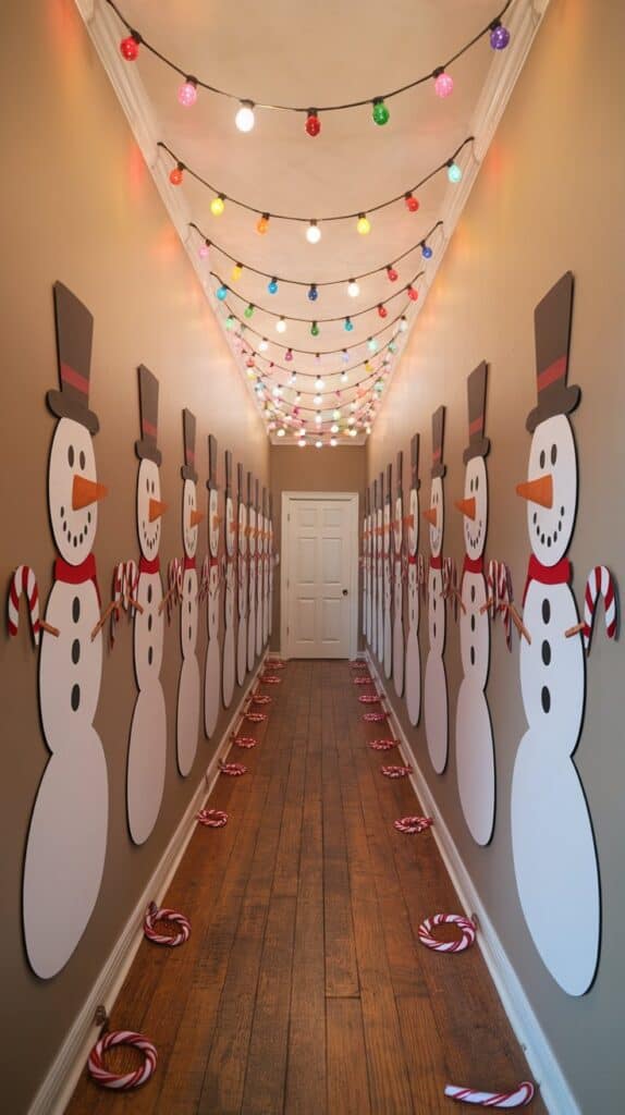 If you want to add some fun to your hallway, think about using snowman cutouts. They can line the walls and make the space feel warm and inviting.