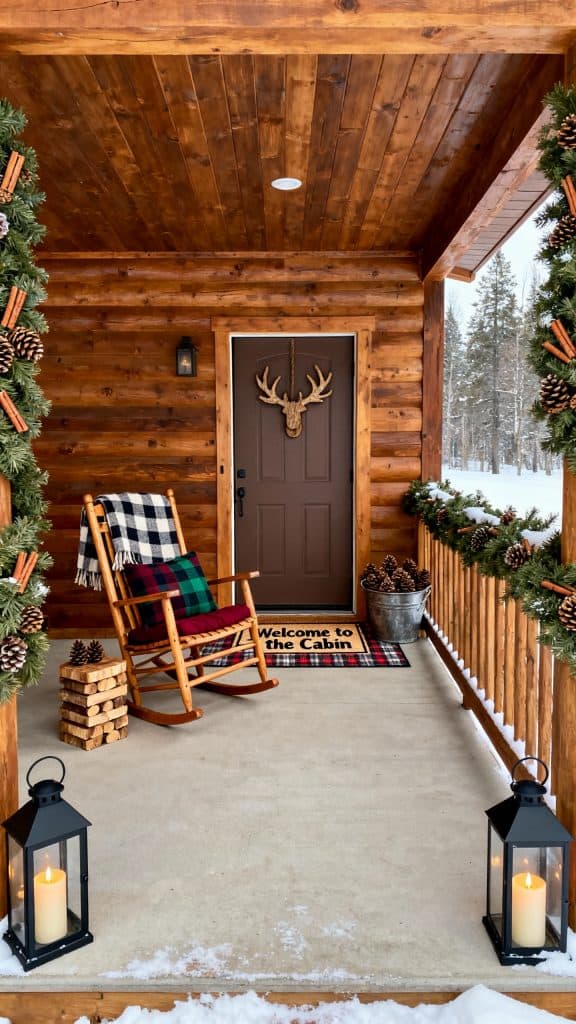 Finish with a layered doormat look: plaid rug under a bold “Welcome to the Cabin” mat. It’s rugged, warm, and irresistibly inviting.