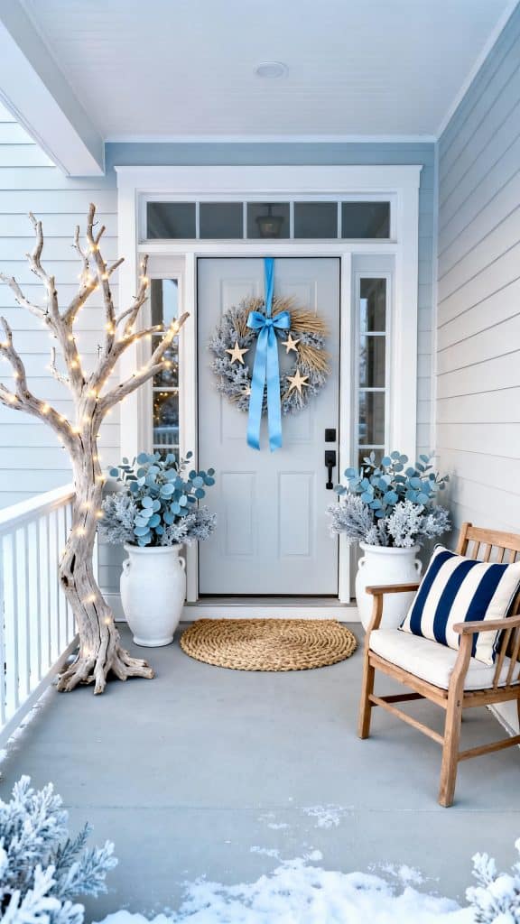 Who says beachy vibes are only for summer? This porch turns winter coastal with icy blues, sandy neutrals, and driftwood textures.