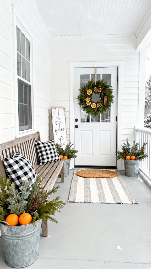 Hang a cedar wreath studded with dried orange slices and cinnamon sticks. Place galvanized tubs filled with mixed evergreens and pop in a few real oranges for color.