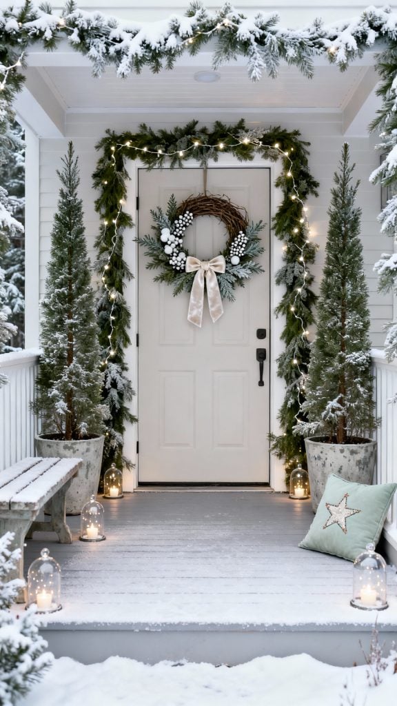 Frame the doorway with snow-dusted garlands and a pair of pencil pines in distressed cement planters. Hang a wispy grapevine wreath with ivory velvet ribbon and tuck in faux snowberries and juniper sprigs.