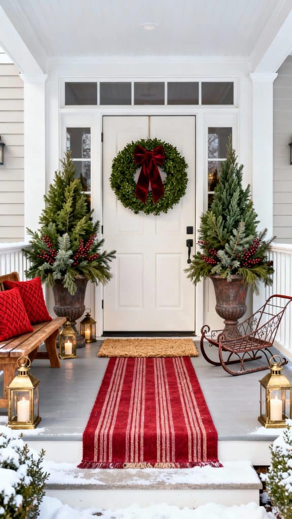 Start with a traditional boxwood wreath with a velvet red bow. Flank the door with urn planters filled with cedar, pine, and berry branches. Layer a striped red runner rug under a coir doormat for a pop of color.