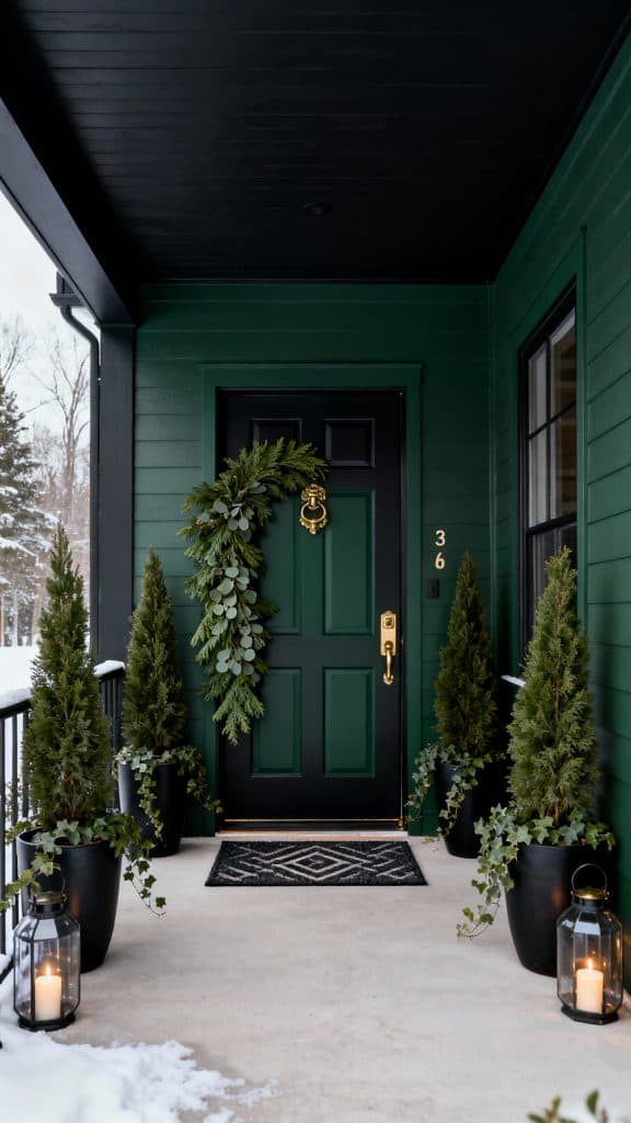 Paint the door black or deep pine green, then hang a thick, asymmetrical wreath with cedar, juniper, and eucalyptus trailing on one side. Use matte black planters with tall, narrow cedars and underplant with trailing ivy.