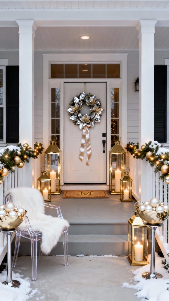 Start with gold-framed lanterns in varying heights on each side of the door. Add pearlized ornaments in oversized bowls on pedestals and a white faux-fur throw over a sleek acrylic chair.